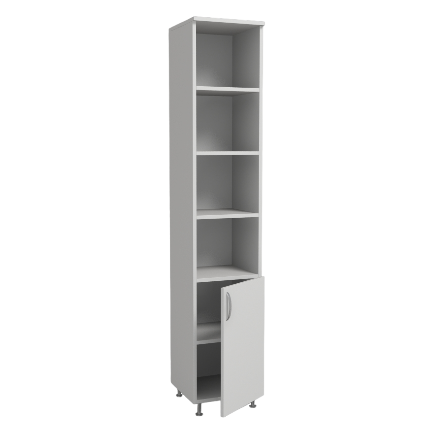 - Шкаф имеет два отделения: верхнее отделение – открытое, оборудовано 3 полками из ЛДСП; нижнее отделение – одна полка ЛДСП за распашной дверкой. Петли на дверке – накладные, с возможностью открытия на 110°. Ручка – хромированная скоба 96 мм.