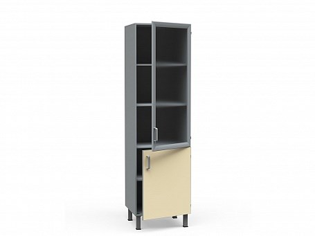 Корпус шкафа, окрашенного в стандартный светло-серый цвет и укомплектованного 4 полками, изготовлен из ламинированного ДСП, торцы обработаны мебельной ПХВ-кромкой (0,45 мм).