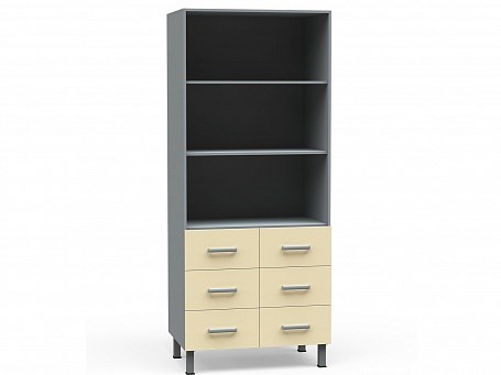 Шкаф-стеллаж с открытыми полками и выдвижными ящиками БТ-ШСя-6-80 представляет собой эргономичную мебельную конструкцию для хранения медицинской документации, фармпрепаратов и расходных материалов.
