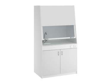 Шкаф состоит из верхней остеклённой рабочей камеры с устройством подъёма подвижного стекла, вытяжным устройством и нижней секции со столешницей облицованной керамической плиткой. Шкаф оборудован врезной мойкой со смесителем.