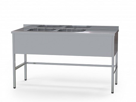 Стол медицинский с цельнотянутыми мойками, с бортом, с фартуком и рабочей поверхностью (справа или слева), на 4 опорах с регулировкой по высоте, усиливающая обвязка по трем сторонам.