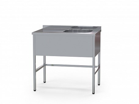 Стол медицинский с цельнотянутой мойкой, с бортом, с фартуком и рабочей поверхностью (справа или слева), на 4 опорах с регулировкой по высоте, усиливающая обвязка по трем сторонам.