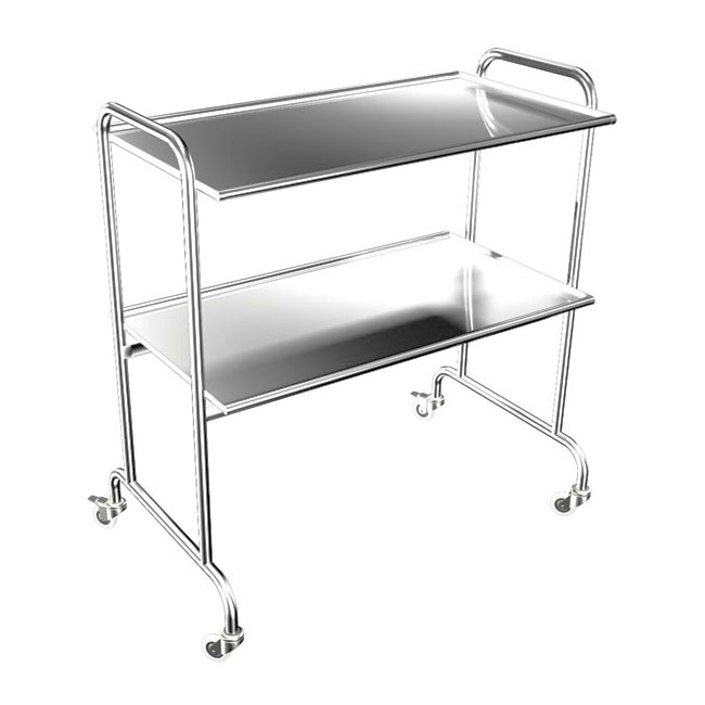 - Столик имеет 2 вынимающиеся полки из листовой нержавеющей стали 0,8 мм с бортиками 16 мм, размеры — 755x395 мм