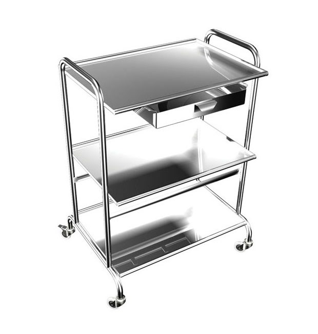 - Столик имеет 3 вынимающиеся полки из листовой нержавеющей стали 0,8 мм с бортиками 16 мм, размеры — 570x360 мм