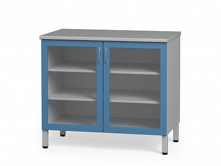 Тумба медицинская металлическая с распашными дверками из стекла в металлическом профиле, с полками БТ-25С