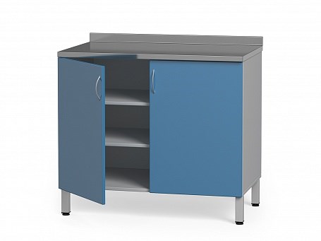 Столешница тумбы изготовлена из нержавеющей стали AISI 304, по заднему борту столешницы имеется бортик, для защиты от затекания жидкостей за тумбу.